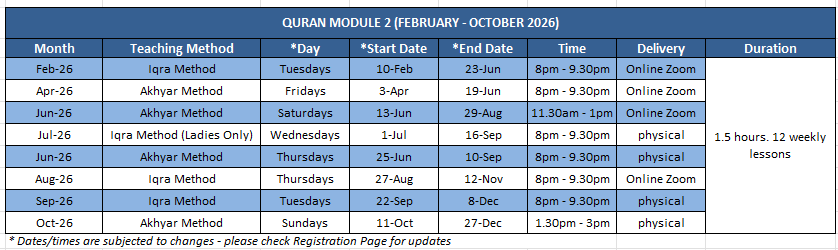This is a follow up course from Quran Reading 1, after recognizing the 28 Quranic alphabets. Having two different methods, Iqra' and Akhyaar methods, this course hopes to instil Quranic fluency to recite short verses of the Quran leading to reciting short Surah from the Juz ‘Amma.