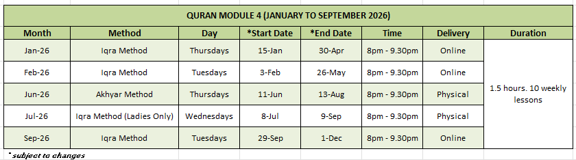 In this course, the teacher will guide the students in proper recitation of Surah An-Naas (Chapter 114) until Surah Al-Qari’ah (Chapter 101); beginning from the last page of the Quran.